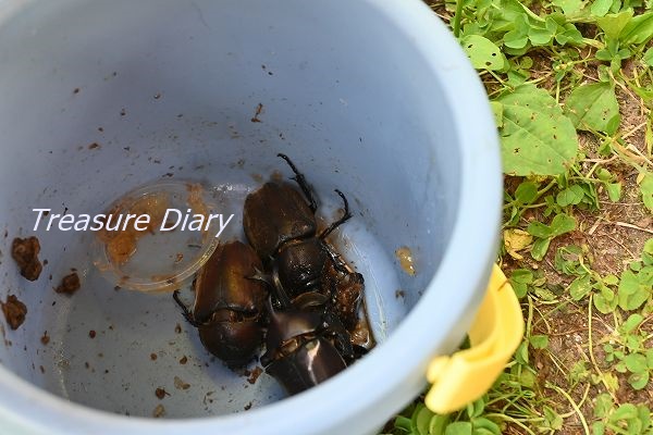 さらに驚くことに、捕獲したカブトムシを、このバナナ入りのバケツに無造作に入れておいた所、朝起きたらカブトムシが増えていた珍事もありました。